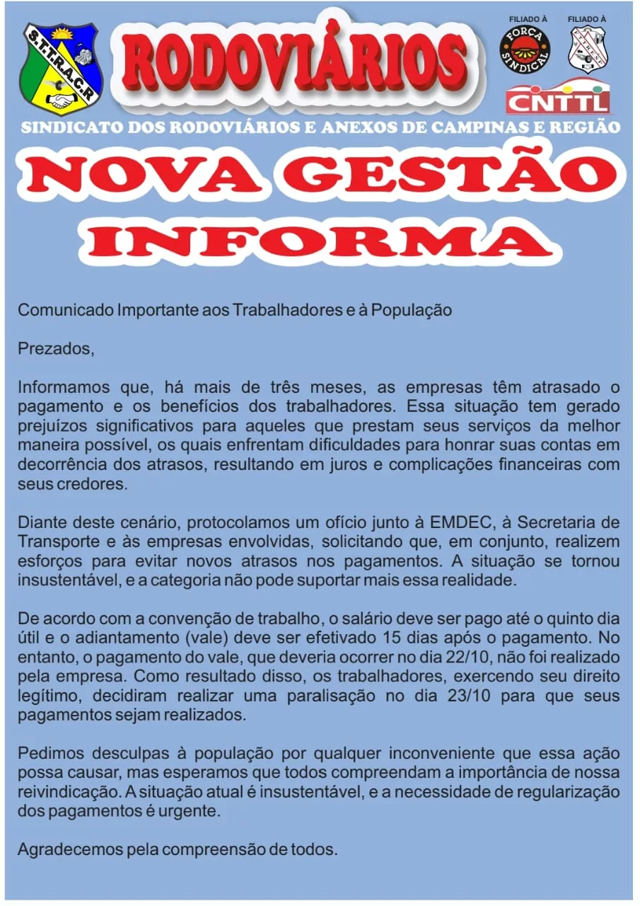 A população de Campinas deve se preparar para um dia de transtornos no transporte público nesta quinta-feira, 23 de outubro. O Sindicato dos Rodoviários e Anexos de Campinas e Região comunicou a realização de uma paralisação geral dos motoristas e trabalhadores do transporte a partir de amanhã.